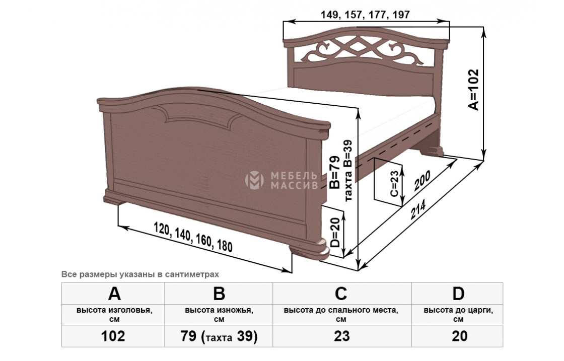Благородная кровать Вирджиня сделана из качественного древесного массива. Изделие имеет изогнутое сплошное изножье и высокое изголовье с узором. Обе спинки плавно переходят в устойчивые ножки, которые защищают пол от повреждений. Купить эту прочную модель по выгодной цене можно в нашем интернет-магазине. Осуществляется доставка на дом по Новороссийску и Краснодарскому краю .| Размер | Цена | |
