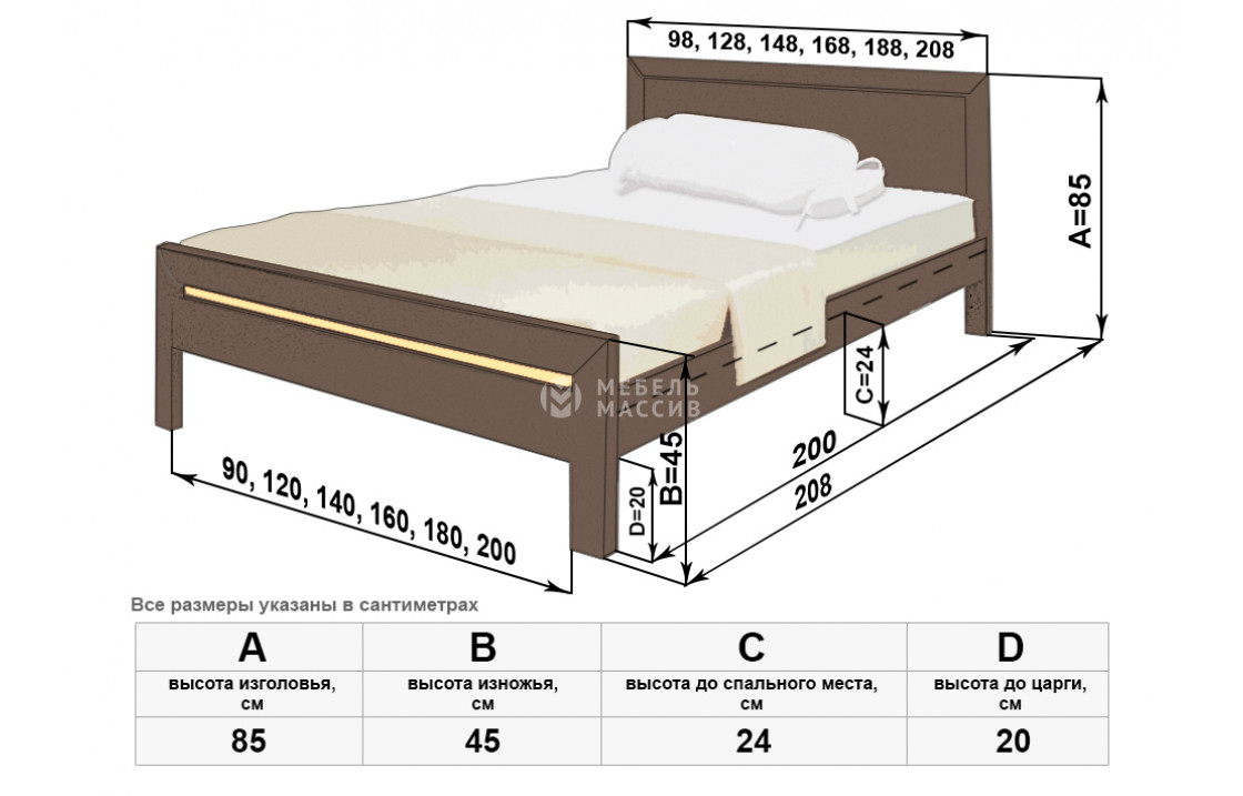 Кровать София имеет традиционную форму: средней длины сплошное изголовье, низкое изножье с горизонтальной прорезью и устойчивые ножки для защиты пола от царапин. Изделие, которое можно купить по демократичной цене в нашем интернет-магазине, изготовлено из натурального древесного массива. Осуществляется доставка на дом по Новороссийску и Краснодарскому краю .| Размер | Цена | |
